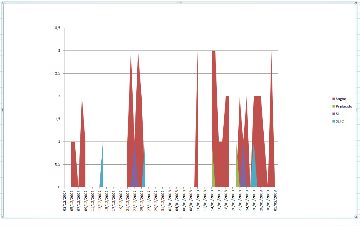 C’è anche da dire che se non ho appuntato niente vuol dire che non ero interessato a farlo e quindi non portato per impegnarmi nella attività onirica. Quel grafico sicuramente sarebbe tutto rosso ma quello che mi interessa è quando si verifica un tipo di SL diverso dal solito.