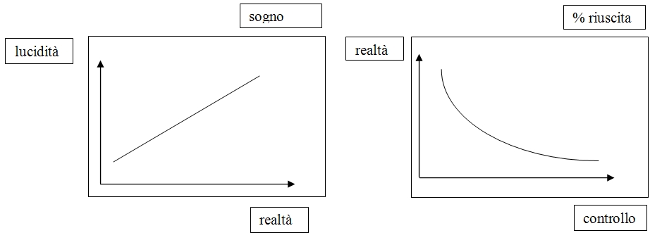 Ho potuto notare nel tempo come sia più facile partire da un prelucido e aumentare in un secondo momento dal SLTC la lucidità piuttosto che partire da un SL aumentando il controllo. Questo perché sebbene lucidità e controllo inconscio sono due cose distinte e differenti è la nitidezza che è difficoltosa, ed essa aumenta al pari della lucidità. Più il sogno è ben definito e più è difficile, perché il nostro inconscio percepisce il mondo onirico come più simile al reale di un “sfocato” prelucido, questo vale per tutti i 5 i sensi umani (che nel grafico chiamerò con “realtà”).