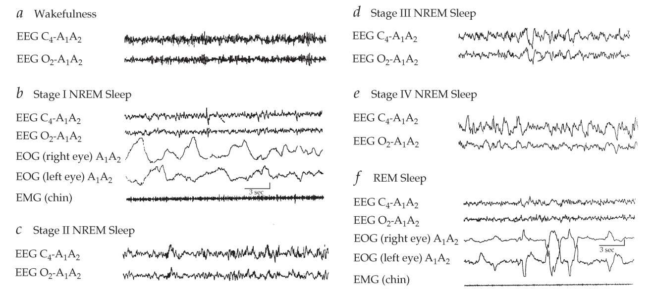 Come potete vedere nel primo grafico sottostante nel caso di fase NREM gli occhi non si muovono. L’EEG (elettroencefalogramma) in questo caso rileva 2 frequenze ed esse sono completamente diverse tra le due fasi, come anche la respirazione.