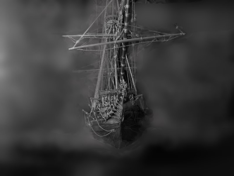 Piu a destra c’era qualcosa di astratto, forse un galeone antico.